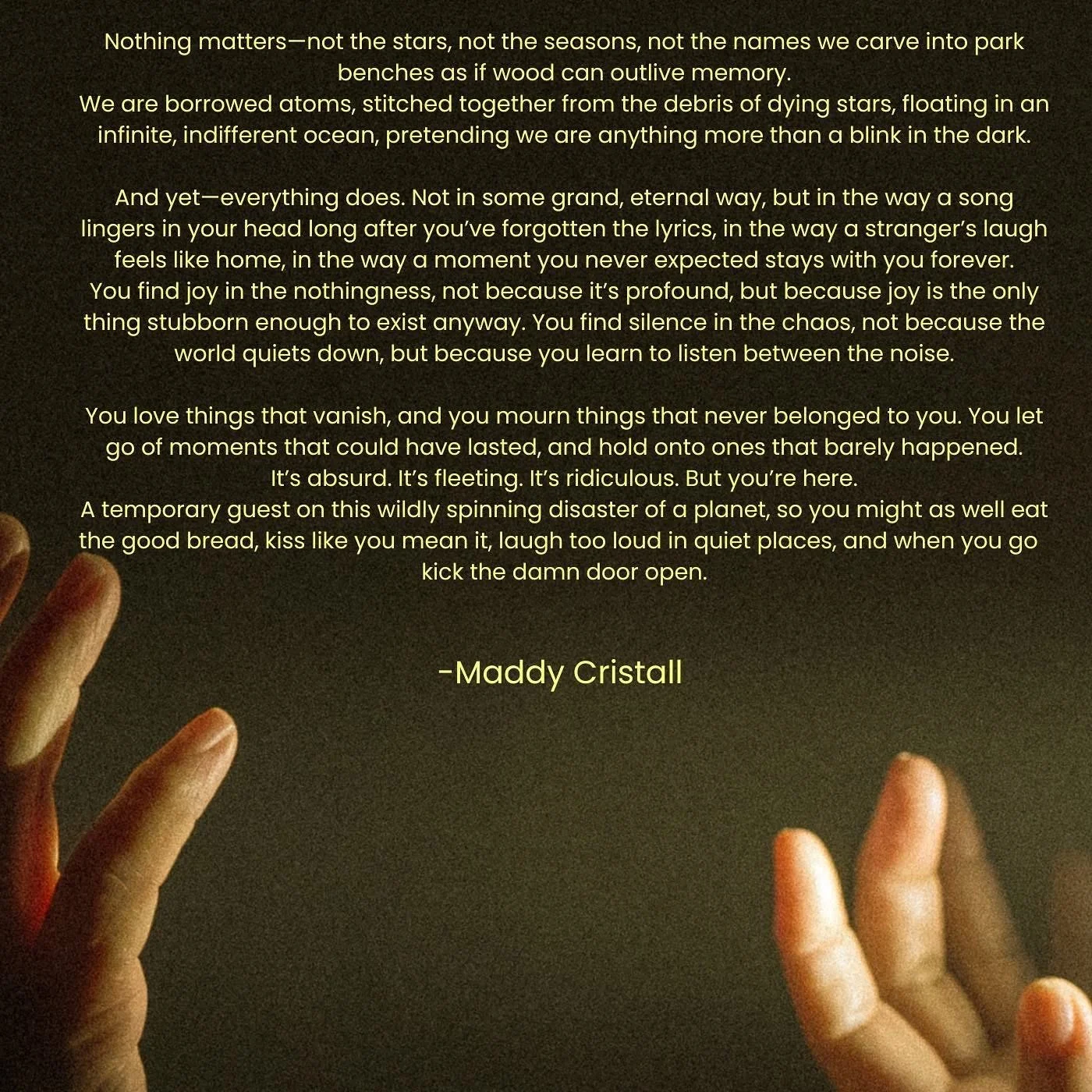 SAMPLES OF WORKRead Below…. Maddy 2025-04-18 Maddy 2025-04-18 Echoes of the Ordinary Read More Maddy 2025-02-07 Maddy 2025-02-07 How to Manifest a Thesaurus Read More Maddy 2025-01-02 Maddy 2025-01-02 Coachella Doesn’t Care What You Think Read More Maddy 2024-05-23 Maddy 2024-05-23 Your Life Doesn’t Need to Fit in a Mason Jar Read More Maddy 2024-04-25 Maddy 2024-04-25 Scars Don’t Define You, They Decorate You. Read More Maddy 2024-03-01 Maddy 2024-03-01 Retire the Term Hipster Already Read More Maddy 2024-02-16 Maddy 2024-02-16 Stop Romanticizing the Tortured Artist Read More Maddy 2023-03-09 Maddy 2023-03-09 Pappy and Harriet’s- The Diamond of the Desert Read More Maddy 2023-03-09 Maddy 2023-03-09 You are not Alone Read More Maddy 2023-02-03 Maddy 2023-02-03 The Problem with the Term “World Music” Read More Maddy 2023-02-02 Maddy 2023-02-02 The Love Song Bob Dylan Never Wrote Read More Maddy 2023-02-01 Maddy 2023-02-01 In the Works Read More